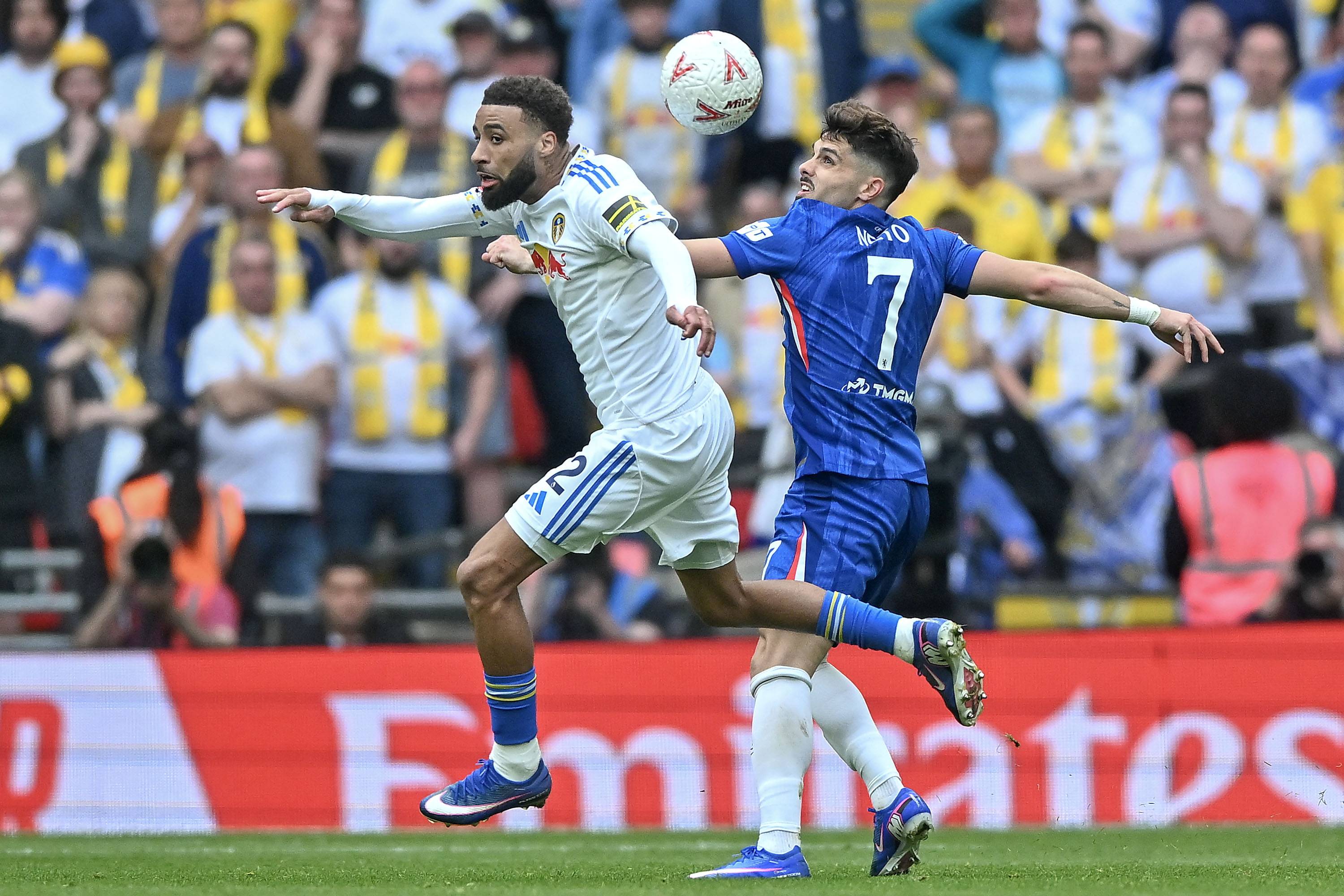 4月26日,切尔西队球员内托(左)与利兹联队球员古德蒙松拼抢。 新华社/欧新